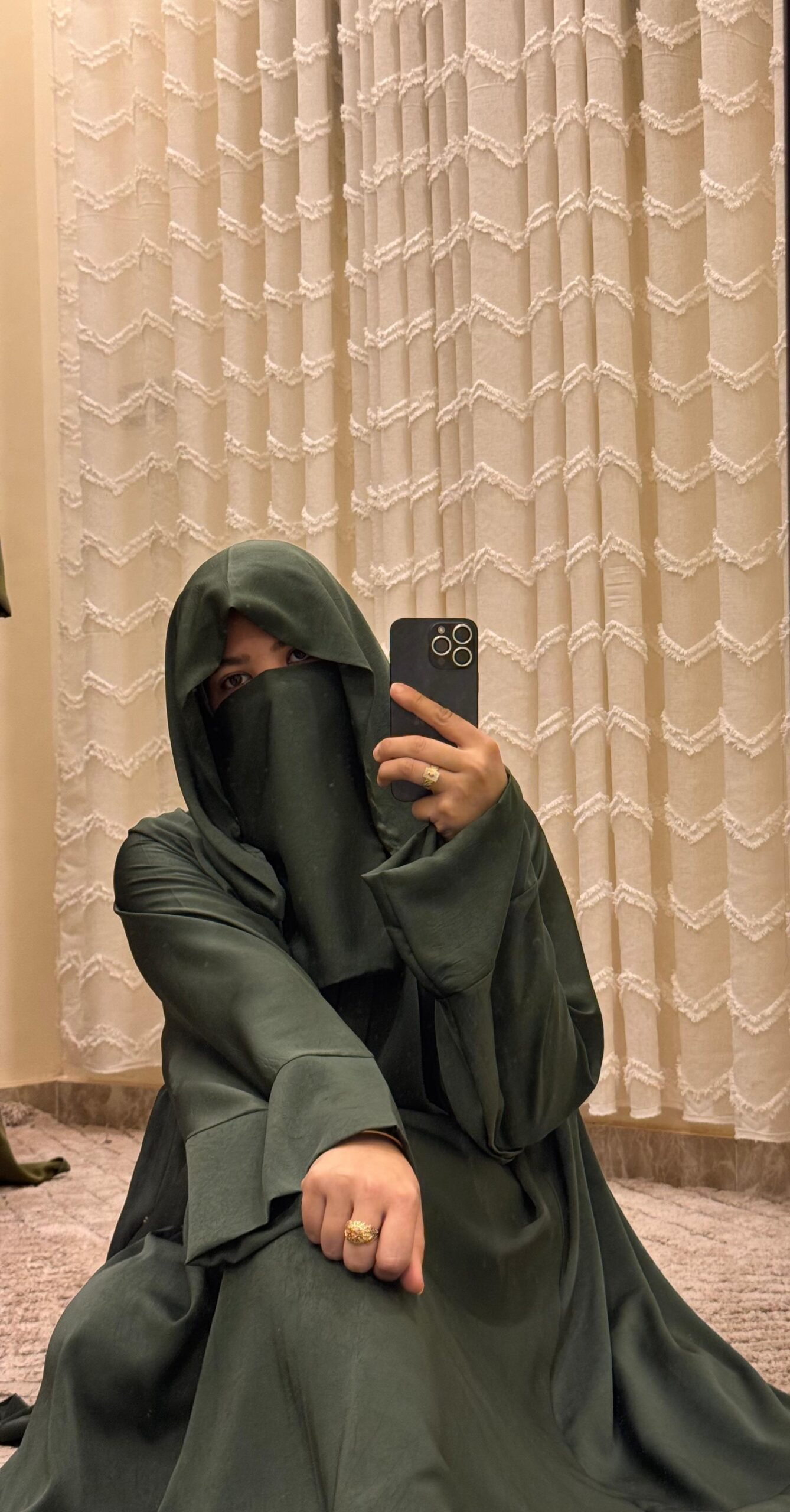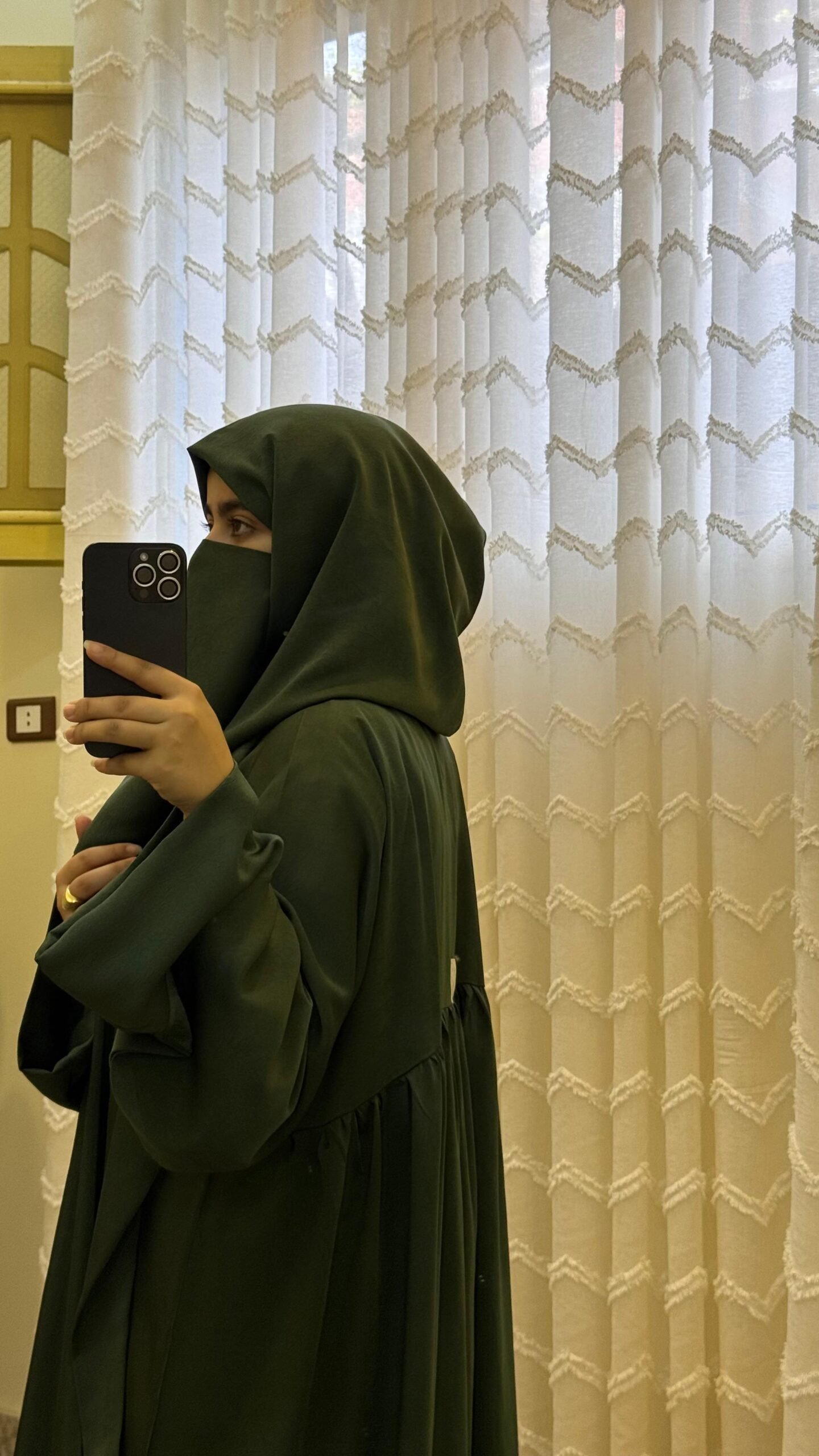 إسدال أنيق باللون الزيتى المخملى، تصميم واسع ومريح فري سايز يناسب حتى وزن 130 كجم وطول 173 سم. مصنوع من ستان فلفيت كريز مستورد ناعم بانسيابية رائعة، مزود بكابيشو ومقفول بمجنت بدل الدبوس لسهولة اللبس والحفاظ على القماش. مثالي لإطلالة محتشمة وأنيقة يوميًا.