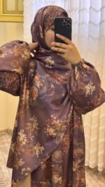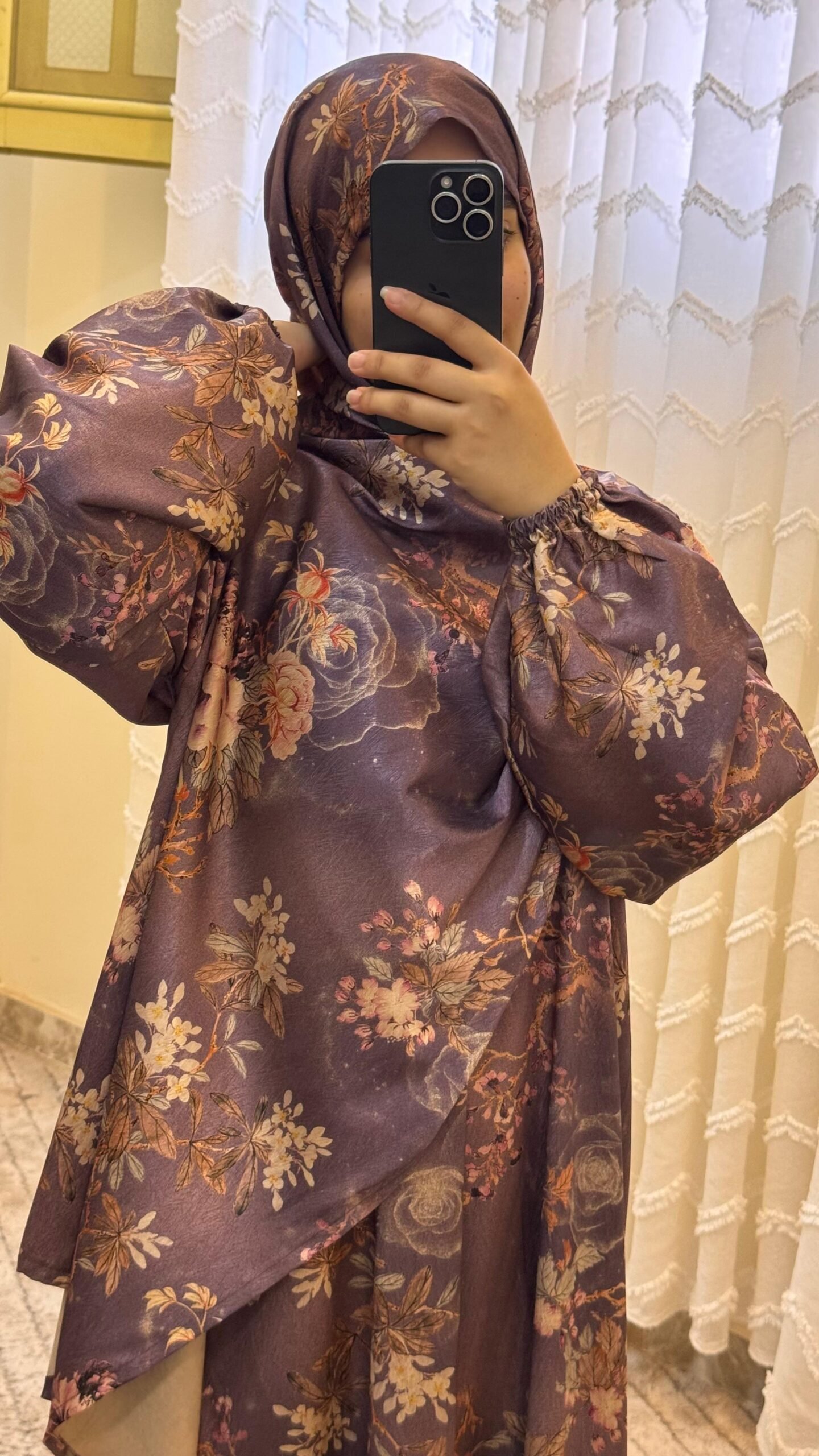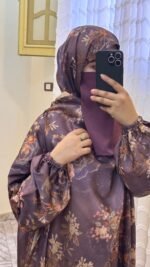 مصنوع من خامة ستان منقوش باللون البنفسج ناعمة وفاخرة، تتميز بملمسها الراقي ولمعتها الهادئة التي تضيف لمسة أناقة مميزة، مع انسيابية رائعة تمنحك شعورًا بالراحة طوال اليوم، سواء في الصلاة أو الخروجات اليومية.