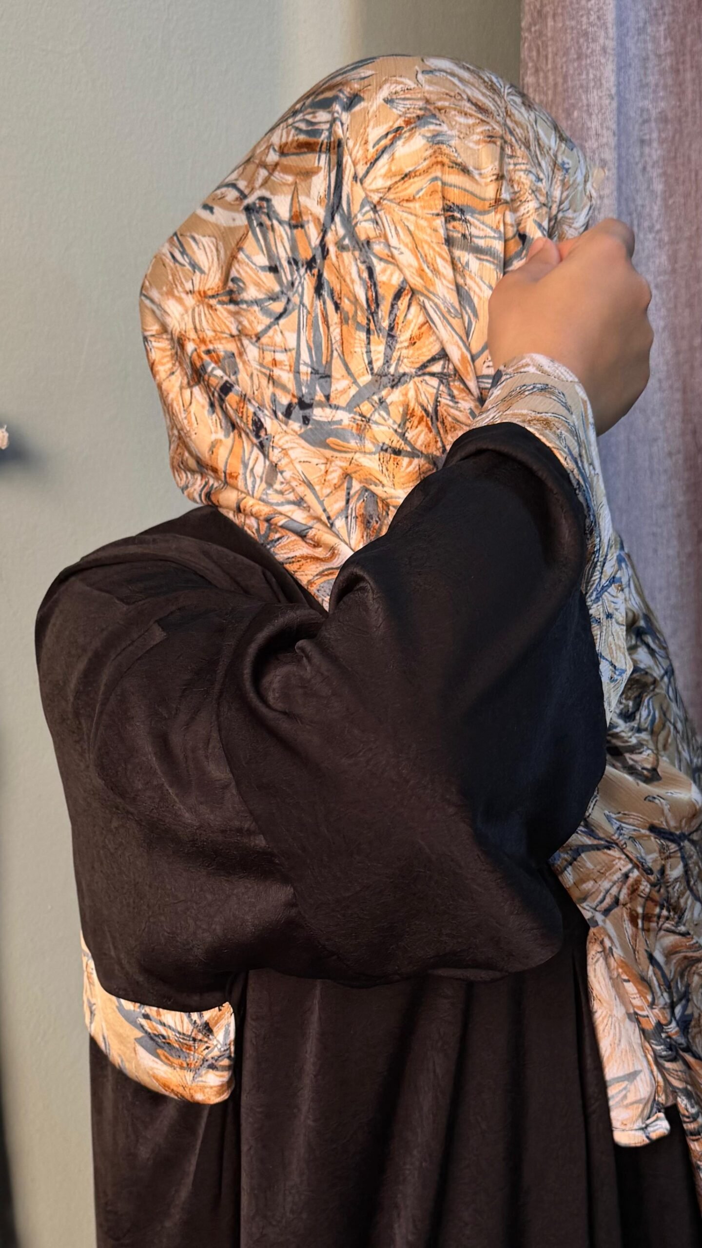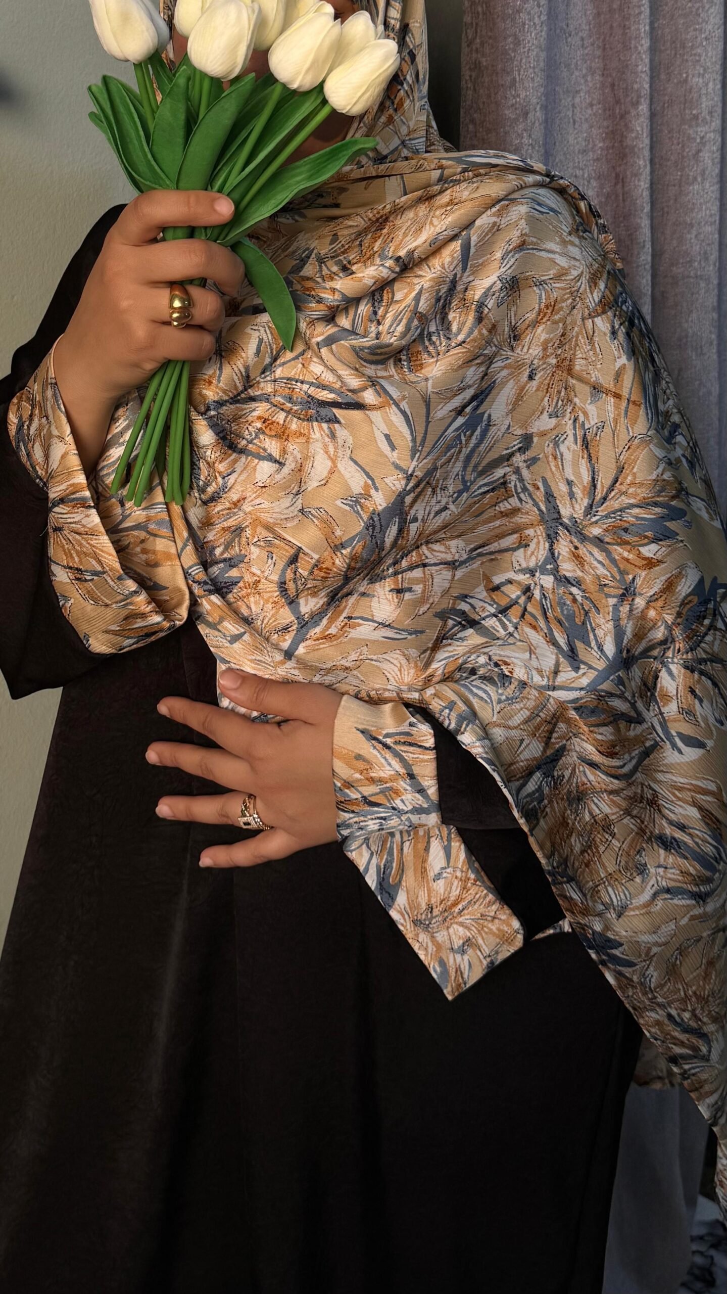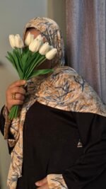 مصنوع من خامة مريحة وناعمة تمنحك إحساسًا بالراحة طوال اليوم، مع نقشة أنيقة تضيف لمسة مميزة للإطلالة، بينما تضفي الطرحة البيج توازنًا جماليًا راقيًا يبرز جمال التصميم.